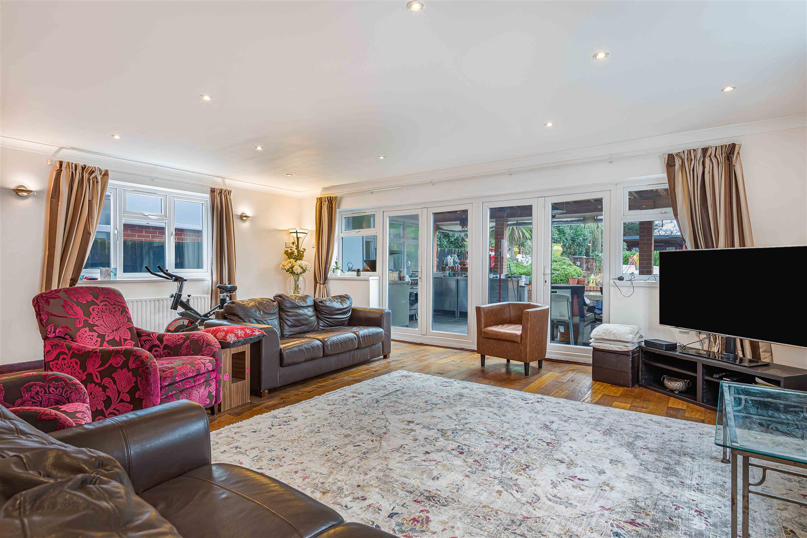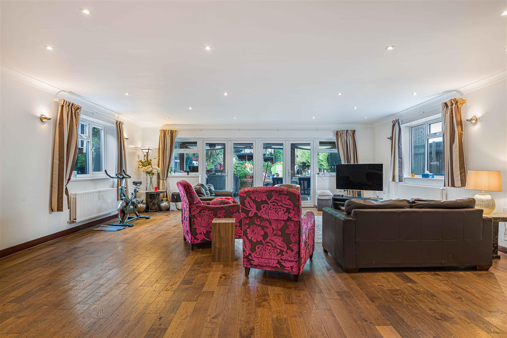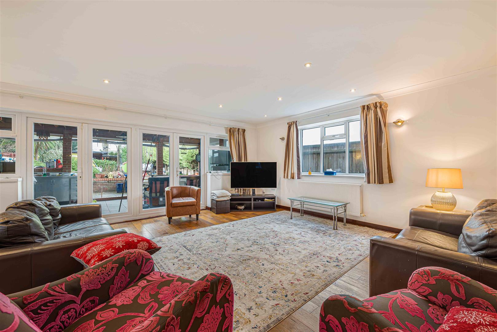 Externally, the property is approached via a large driveway providing extensive off-street parking. The rear garden extends to approximately 133ft and offers a secluded retreat, complete with an outbuilding and dedicated entertaining areas—ideal for outdoor living.