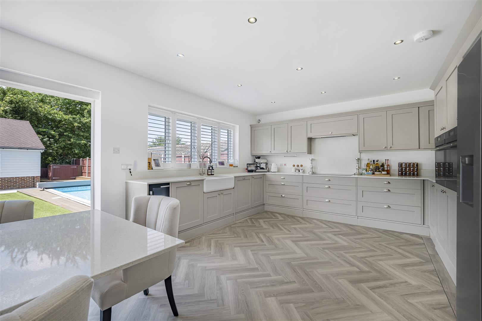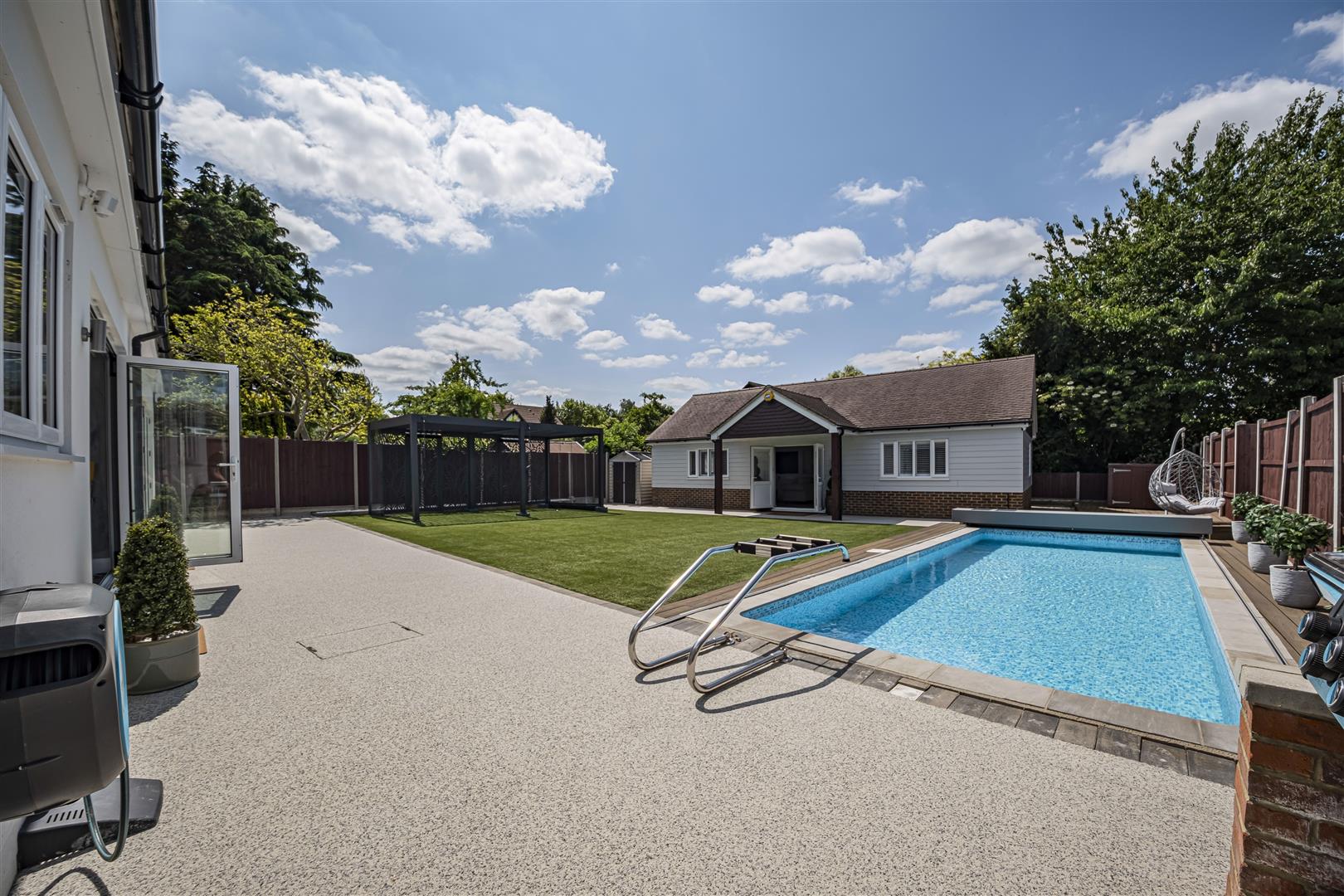 Nestled within a secluded and private plot in the semi rural village of Crockenhill, is this stunning and deceptively spacious four bedroom detached home, with an additional one bedroom detached dwelling to the rear of the property. This stunning home has been extended and finished to a high standard throughout, with accommodation comprising of entrance hall, three double bedrooms, one reception room, luxury fitted kitchen / diner, utility room and a ground floor shower room. To the first floor there is a luxury bathroom and master bedroom with walk in wardrobe. Externally the property is approached via automated gates and a generous driveway with ample off street parking. To the rear is a private and secluded landscaped rear garden with heated swimming pool. There is an additional one bedroom detached dwelling to the rear with modern fitted kitchen, one large reception room and a luxury ensuite bathroom. Additional benefits to note include luxury furnishings, double glazing, gas central heating, resin driveway, CCTV, bi-folding doors, air conditioning, artificial grass and fitted shutter blinds. Viewing is a must to fully appreciate the finish and space on this fantastic home.